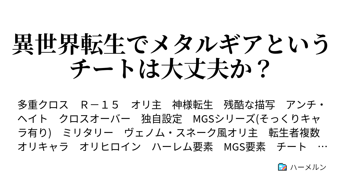 ハーメルン ガールズ&メタルギア 終結後、東西は二分に分かれた。 冷戦という時代の幕開け じゃなーい! 二足歩行戦車道。 メタルギアで戦う部活みたいなものである(メタルギア同士で戦うとは言ってない) 小説閲覧設定最近ハーメルン見た小説で個人的にオススメしたい作品を紹介するコーナーです。 ※これは21年3月3日時点でのレビューとなっています。 作品名 saoナーヴギアで目玉焼き作ってみた一万人全員生存 原作 ソードアート・オンライン 内容 ソードアート・オンラインの短編小説です。暇を持て余した管理者たちは暇つぶしに管理している世界の人間を他の世界への異物として混入させ観察する。 これはフルダイブゲームと信じて『メタルギア』の世界に混入させられた少年の物語。 ※毎月十日に投稿